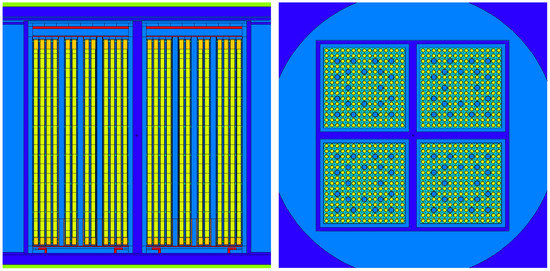 The axial (left) and radial (right) views of the canister MCNP model loaded with fresh UO2 fuel.