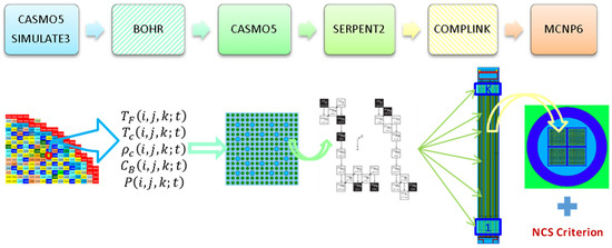 For the depletion phase, the two-dimensional (2-D) fuel assembly depletion code CASMO5 [14] was employed with feedback from the three-dimensional (3-D) reactor code SIMULATE-3 [15] using the in-house BOHR tool [8,16], as illustrated later in Section 2.3.