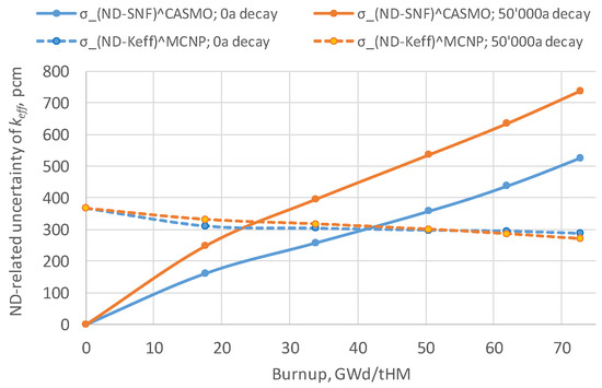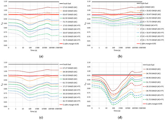 The results obtained are summarised below in Section 3.2.1, Section 3.2.2, Section 3.2.3 and Section 3.2.4. It should be mentioned that the observed behaviour is in line with already published results for similar situations analysed and discussed in detail in Reference [28]. In brief, it can be recalled here that the decrease of within the first approximate 100 years is mainly related to the decay of 241Pu (T1/2 ≈ 14.4 years), as well as the build-up of 241Am (in the case of AC+FP, also the build-up of 155Gd as a result of the beta-decay of 155Eu is important). Later, the increase of up to around 30,000 years is explained by the decay of 241Am (T1/2 ≈ 432 years) and 240Pu (T1/2 ≈ 6,560 years). At a later time, starts to decrease again mainly due to 239Pu decay (T1/2 ≈ 24,100 years). The given explanations and the half-life (T1/2) data are borrowed from Reference [28].