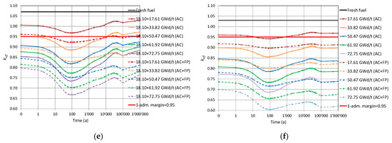 The empty position is assumed to be also flooded with water. The results plotted in Figure 4f show that fuel with a limiting burnup of 19 GWd/tHM can be considered if using the AC approach and 10 GWd/tHM for the AC+FP approach.
