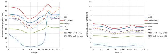 The evolution of minimum burnup credit required to comply with a value below 0.95 within the geological disposal timeframe: AC case (left) and AC+FP case (right).