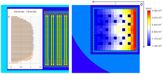 Figure 2 shows the MCNP model describing the canister (not in full detail as compared with Figure 6 given later; the model’s outer boundaries are cut as they are not significant for presentation) and the fuel assemblies with the discrete axial spent fuel specifications (see further details in Section 4.2.1).