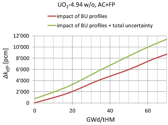It can be seen from Figure 11 that, for the given USL value and for the case of UO2, 4.94 w/o fuel, the saving in terms of the minimum required burnup as compared between the cases of AC+FP vs. AC is about 24 GWd/tHM (this has been illustrated in more detail in Reference [29]). This result was obtained by comparing the cases which take into account the bounding burnup profiles and also all uncertainties listed in Table 7. Basically, the same effect (23 GWd/tHM) can be observed for the case when only bounding burnup profiles are taken into account with no uncertainties contribution. A much weaker effect would be obtained (16 GWd/tHM) if the calculations were done with nominal burnup profiles instead of the bounding ones. Finally, a comparison between two values of the administrative margin was also shown in Reference [29]: for the conventional value of 5000 pcm and for a reduced one of 2000 pcm. This illustration allowed the prediction of what saving in the minimum burnup requirement could be achieved, provided the administrative margin could hypothetically be relaxed to 2000 pcm. The extra saving for such a case was estimated as approximately 12 GWd/tHM.