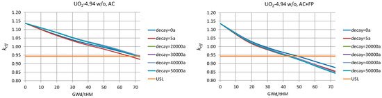 For the burnt fuel configurations, the analyses were conducted for each of the assembly-averaged burnup levels reached after every reactor cycle. The spent fuel compositions keep changing after irradiation due to the decay processes, and therefore, the fuel neutronic properties (“reactivity”) are changing as well. The calculated curves of the evolution are plotted in Figure 4 for a flooded canister at different instants during the decay of the isotopes for both AC and AC+FP cases.