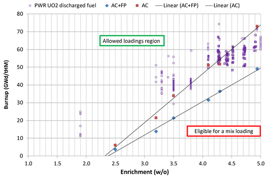Next, a mixed burnup configuration was investigated, as reported in Figure 4b. One FA at low burnup (17.61 GWd/tHM) is considered in the mixed loading with the other three FAs of higher burnups. The results show that high burnup fuels are needed (above 50 GWd/tHM) when taking credit only for actinides.