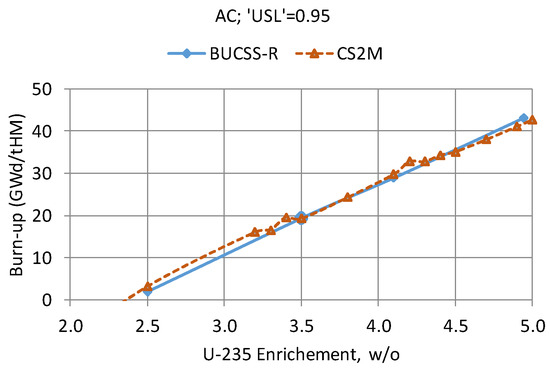 The criterion for nuclear criticality safety assessment, conventionally termed the Upper Subcritical Limit (USL) hereafter, which accounts for the burnup credit of the spent nuclear fuel, is discussed in detail later in Section 4.1. Here, it must only be mentioned that the criticality safety criterion may vary depending on the methodology definition and on the national regulatory requirements. However, one particular component is basically common to all countries and methodologies, namely the so-called “administrative margin” (also referred to as “an arbitrary margin to ensure the subcriticality” [26]), which will be denoted here as . Normally this margin equals 0.05 in terms of the absolute value [13,27], and it is typically dominant compared to all other margins and imposed uncertainty components. The last comment is especially true for the fresh fuel case, but even in the case of spent fuel, the depletion-related uncertainties and margins, e.g., assessed in Reference [13], are noticeably smaller as compared with 0.05. Thus, the USL values obtained with different methodologies by different organisations and countries for the same type of applications may vary but are normally not too far from the = 0.95 value. Therefore, for the sake of a better representability and an easier comparison with similar studies, it makes sense to consider the = 0.95 value as the simplified criticality criterion selected for the consequent bounding case assessments, while for the final loading curve derivations, the PSI methodology-specific USL value will be employed.