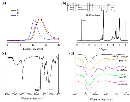 (a) GPC (Gel Permeation Chromatography) trace of MBDA copolymer; (b) 1H NMR (Hydrogen Nuclear Magnetic Resonance) spectrum of MBDA copolymer in CDCl3; (c) FT-IR (Fourier transform-infrared) spectrum of MBDA copolymer; (d) FT-IR spectra of pure monomers with confined wavenumbers ranging from 1800 to 1550 cm−1 (focused on the unsaturated “C=C”).