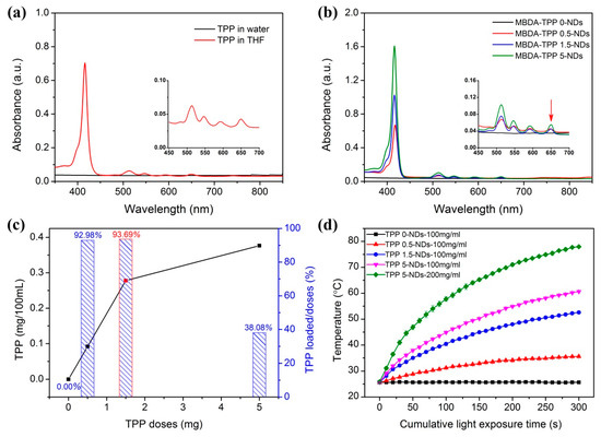 UV–Vis absorption spectrum of different dispersions: (a) TPP in aqueous solution and THF; (b) micelles without TPP and MBDA–TPP–NPs loaded with different TPP in aqueous solution; (c) the TPP concentrations and the corresponding TPP load factor of MBDA–TPP–NPs dissolved in THF at 417 nm; (d) Temperature rise of 500 μL MBDA–TPP–NPs in different concentrations as a function of light exposure time.