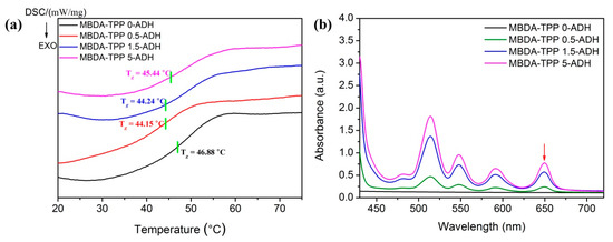 Characterizations of MBDA–TPP–ADH films with different TPP doses: (a) DSC traces; (b) UV–Vis absorption spectrum.