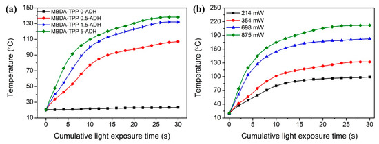 Light (655 nm)-induced heating rises of various films (thickness: 0.3 mm). (a) Temperature of films loaded with different TPP vs. exposure time under 354 mW/cm2 lamp within 30 s; (b) effect of light intensity (214, 354, 698, and 875 mW) on laser-induced heating of a MBDA–TPP 1.5–ADH film.