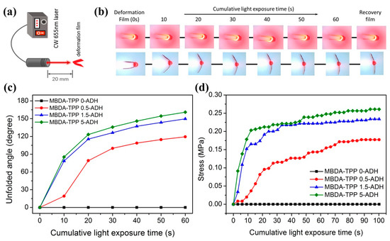 (a) Schematic illustration of the setup layout used to investigate light-actuated shape recovery of the film upon irradiation; (b) photographs of the shape recovery process of MBDA–TPP–ADH films loaded with different TPP upon irradiation; MBDA–TPP 0–ADH (up), MBDA–TPP 5–ADH (down); (c) the plot of unfolded angle vs. exposure time (0–60 s) of various films; (d) contraction force generated by exposing stretched films (thickness: 0.13 mm) with an extension of 140% to the laser (214 mW/cm2) at room temperature.