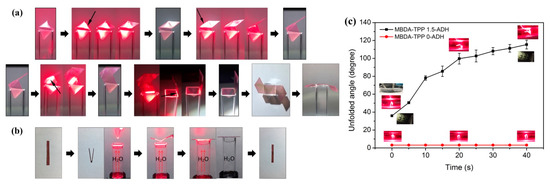 To state the ability of this material for use “within an aqueous solution”, the film (7.45 × 6.80 × 0.30 mm) was submerged in water prior to light activation, three times. Figure 7c shows the unfolded angle of MBDA–TPP 1.5–ADH and MBDA–TPP 0–ADH films, immersed with exposure time within 40 s (528 mW/m2). Compared with film without TPP, MBDA–TPP 1.5–ADH film exhibited a superior shape recovery upon the light irradiation, the recovery speed of the first 10 s was fast, and then tended to be gentle. After cumulative exposure time of 40 s, the recovery rate of the film reached ~70%. In addition, it is worth to mention that no significant fluctuations (33.3–33.8 °C) were found for the temperature of water environment, indicating that the thermal tissue damage caused by the heat released from the material was negligible.