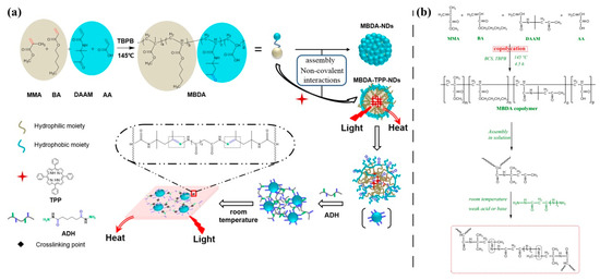 (a) Schematic illustration of the preparation of infrared light-active porphyrin-containing shape memory polymer. (b) Synthesis of the MBDA (Methyl methacrylate-Butyl acrylate-Acrylic acid- Diacetone acrylamide) copolymer and crosslinking in micellar particles.