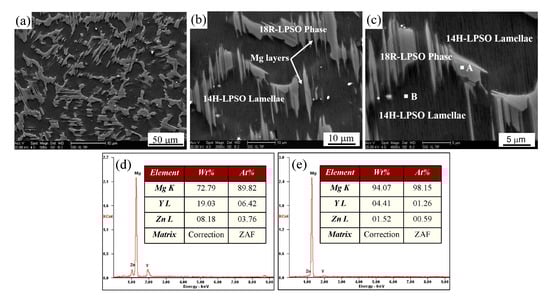 Figure 2 shows the microstructure of the as-cast Mg95.5Y3Zn1.5 alloy. As shown in Figure 2a, the alloy mainly consists of α-Mg matrix (with dark contrast) and LPSO phase located at the grain boundaries (with grey contrast). The LPSO phase presents lamellar structures with some Mg layers inside the phase, as indicated by the white arrows in Figure 2b. The volume fraction of the LPSO phase is estimated to be ~38% in the as-cast Mg95.5Y3Zn1.5 alloy. Besides, plenty of fine LPSO lamellae are observed in the interior of the Mg matrix, which arrange uniformly with single direction in a whole grain as shown in Figure 2b,c. Figure 2d,e show the EDS results of the as-cast Mg95.5Y3Zn1.5 alloy. The chemical composition of the phase with grey contrast (marked as A in Figure 2c) and the fine lamellar phase (marked as B in Figure 2c) is Mg-6.42 at.% Y-3.76 at.% Zn and Mg-1.26 at.% Y-0.59 at.% Zn, respectively. The composition of the grey phase is equivalent to that of the LPSO phase (Mg-6 at.% Y-4 at.% Zn) observed in the Mg97Y2Zn1 (at.%) alloys [16]. In the case of the lamellar phase, Y and Zn elements are present in a roughly similar proportion of the LPSO phase. In fact, the LPSO phase located at the grain boundaries exhibits a 18R-type LPSO structure, and the LPSO lamellae in Mg matrix exhibit a 14H-type LPSO structure. The confirmation of the LPSO structures was discussed in the following section.