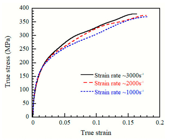 True stress-strain curves of the as-cast Mg95.5Y3Zn1.5 alloy tested at the strain rates of ~1000 s−1, ~2000 s−1, and ~3000 s−1.