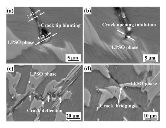Fourthly, as shown in Figure 5d, the crack consistently propagated along its original direction, but it did not fracture the LPSO phase when it encountered the LPSO phase. The LPSO phase just acted as a “bridge” to connect both sides of the crack surfaces. In this situation, the LPSO phase is expected to offer a closure stress, which makes the crack surfaces close to each other. Hence, the crack opening is hindered by the LPSO phase. It is considered that the LPSO phase can toughen the alloy via a “crack bridging” mechanism.