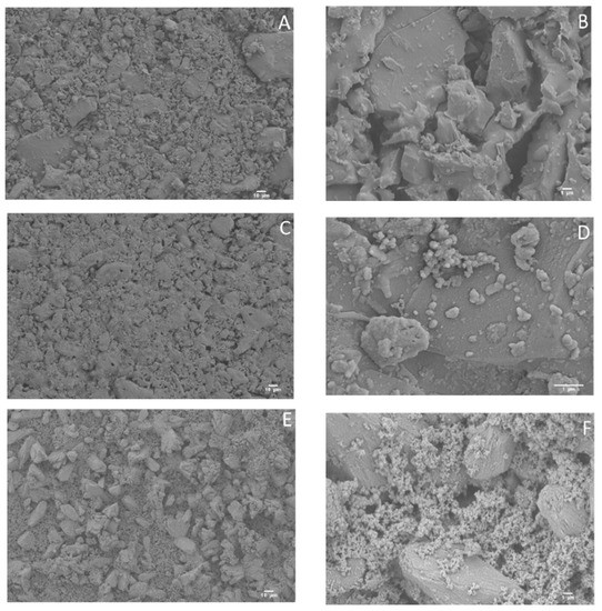 Scanning electron microscopy (SEM) micrographs of uncoated BGC1 (A,B), BGC1@PDA (C,D), and BGC1@PDA@Ag (E,F).