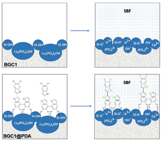 Schematic representations of the origin of negative charge on the uncoated (BGC1) and coated (BGC1@PDA) surface in diluted SBF at pH ≈ 7.4.