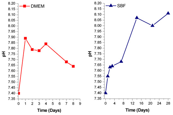 pH variation of DMEM (left) and SBF (right) containing uncoated BGC1 pellets.