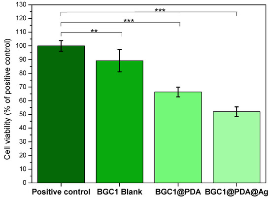 Viability of MG-63 cells cultured onto BGC1, BGC1@PDA and BGC1@PDA@Ag samples for 48 hours. Significant differences are indicated in comparison to control: * p < 0.05, ** p < 0.01 and *** p < 0.001 (Tukey’s posthoc test).