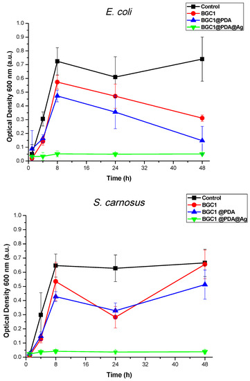 For the test carried out against E. coli, it seems that both BGC1 and BGC1@PDA inhibited the growth of bacteria after 24 hours of incubation. There is a controversy in literature, as some authors have described that polydopamine has an intrinsic antimicrobial effect, which is relatively weak against E. coli [32,54]. Meanwhile, some other works have determined that polydopamine itself does not show an antibacterial effect against E. coli [55]. In Figure 6 it is possible to observe a similar trend for both samples (BGC1 and BGC1@PDA), rejecting the hypothesis that polydopamine itself presents antimicrobial properties.