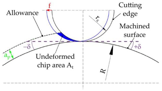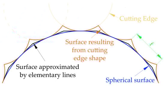 A literature analysis reveals a lack of studies and mathematical models observing the phenomenon. A similar phenomenon is observed during the milling of curvilinear surfaces using spherical cutters, which has been widely analyzed in the currently available scientific literature. The geometrical analysis confirms the insignificant effect of the simplification on the analyzed contour shape (e.g., for an arc with radius R = 14 mm, its bend deflection is 1.3 µm for 0.12 mm length) and the shape of the undeformed chip area. During the milling process, similar simplifications are applied for the analysis of the curvilinear surface.