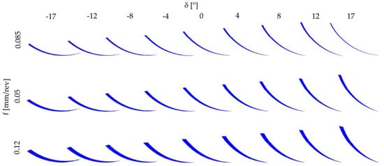 During the turning, the change of the undeformed chip area shape At take place (Figure 1). The consequences of these phenomena are: machining with various parts of the cutting edge, change of the chip flow direction, and change of the machined surface roughness. Curvilinear surfaces with a radius of curvature R = 14 mm were subjected to turning with a cutting edge radius rε = 1.588 mm. The selected parts of the undeformed chip areas At for the different tilted angles of surface δ and feed rates f are shown in Figure 2.