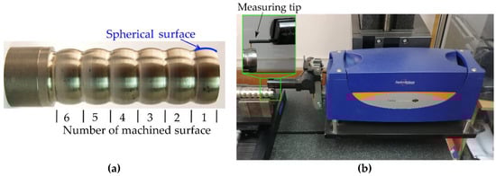 During the experimental test, six spherical surfaces with radius of curvature R = 14 mm and length L = 10 mm were subjected to turning (Figure 4a) with a cutting edge radius rε = 1.588 mm. Different initial parameters, such as feed rate f and cutting speed vc, were applied (Table 3). The tests were carried out based on a complete plan for 3 levels of feed rate and 9 levels of tilted angle. Additional experiments for 3 levels of cutting speed variation were made to determine its effect on the surface roughness. During the tests the tool holder with symbol RF123F10-2525B and sintered carbide cutting insert N123F1–0318–R0S05F were used. Turning of a curvilinear surfaces was performed using CNC machines that applied a cutting insert with an R shape and using interpolated axes. Cutting speed was maintained at a constant value by modifying the rotational spindle speed value, which depends on the diameter of the machined surface fragment. During the tool movement along the curvilinear surface, the modifications of the angles between the cutting insert flank face and work surface occur.