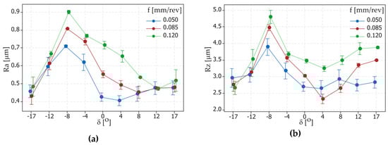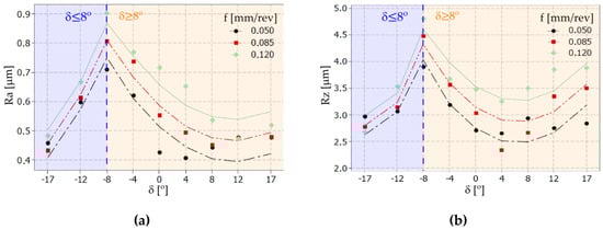 Graphs representing the relation between the tilted angle δ of the machined surface and the feed rate f for the surface roughness parameters: (a) Ra; and (b) Rz.