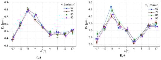 Graphs representing the relation between the tilted angle δ and surface roughness parameters: (a) Ra and (b) Rz; for different cutting speed vc values.