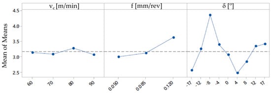 In the turning process (one of the most used in manufacturing technology), the values of machining parameters (feed rate, cutting speed, and cutting depth), nose radius, cutting time, cutting fluid, and cutting forces are subjected to optimization [,]. The cutting data directly affects the surface roughness, dimensional accuracy, tool wear rate, machining performance and manufacturing costs. The selection of appropriate parameters in order to improve surface finish is difficult [,,].