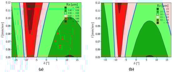 The contour maps were created based on the measured spherical surface roughness (Ra and Rz) for selected tilted surface angles δ. The area of possible solutions determined by using the mathematical models is depicted in Figure 10. The zones with red color include the IT7 class of the surface roughness (Ra = 1.25 μm, Rz = 6.3 μm). However, the zones with green color include the IT8 class (Ra = 0.63 μm, Rz = 3.2 μm).