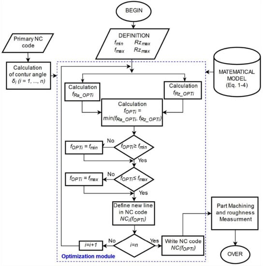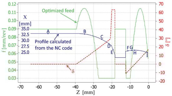 The second part of the research consisted of generating and optimizing the NC code according to the algorithm presented in Figure 11. Due to the possibility of saving only one feed rate in the one code line (one tool movement), the analyzed contour of the part was divided into smaller fragments with a length 0.5 mm. Next, the tilted angle δI of the contour and the initial parameters (such as: fmin = 0.03 mm/rev, fmax = 0.14 mm/rev, Ramax = 0.63 μm and Rzmax = 3.2 μm) were determined. In the next step, feed rate optimization was performed on the basis of the mathematical model, presented in the Section 2.2 (Equations (3) and (4)). The calculated feed rate values (fRa_OPTi, fRz_OPTi and fOPTi) were compared with the limit values fmin and fmax. In Figure 13, the optimized feed rate values fOPT and the marked contour of the machined surface are presented.