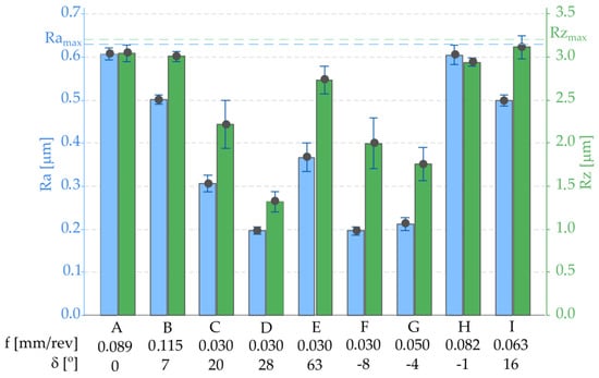 As a result of the feed rate optimization, the desired goal was achieved, meaning that the values of the surface roughness parameters were below their upper limit values (Ra ≤ 0.63 μm and Rz ≤ 3.2 μm) regardless of the surface shape and its tilted angle. The average values with standard deviations of the surface roughness parameters Ra and Rz, measured in points such as A–I (according to Figure 13), are shown in Figure 14.
