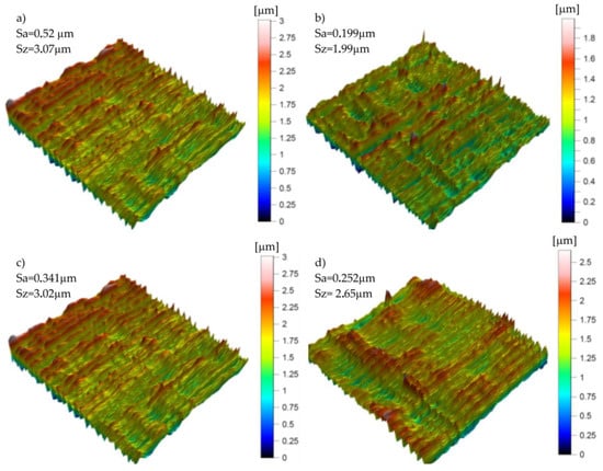 During the experimental tests, the measurements of 3D surface roughness were carried out. Examples of the topographies and isometric views of points such as B, D, E, and G (according to Figure 13), are shown in Figure 15.