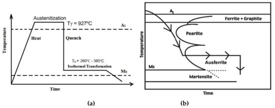 - Yang, J.; Putatunda, S.K. Improvement in strength and toughness of austempered ductile cast iron by novel two-step austempering process. Mater. Des. 2004, 25, 219–230. [Google Scholar] [CrossRef]