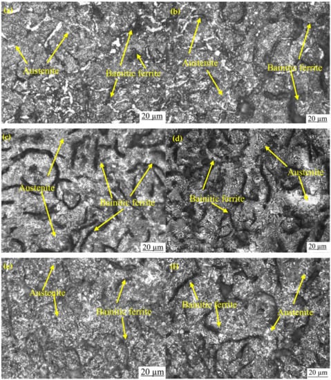 Optical micrographs of samples austempered for 60 min at (a) 260 °C, (b) 285 °C, (c) 310 °C, (d) 335 °C, (e) 360 °C, and (f) 385 °C.