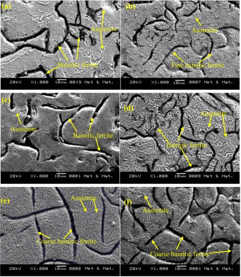 SEM images of samples austempered for 60 min at (a) 260 °C, (b) 285 °C, (c) 310 °C, (d) 335 °C, (e) 360 °C, and (f) 385 °C.