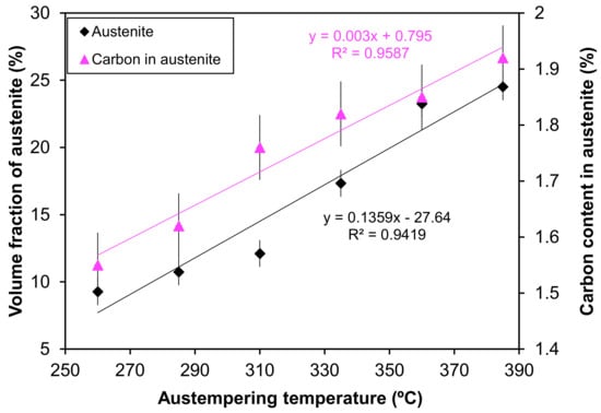 The influence of different austempering temperatures on the volume fraction of austenite and the carbon content of austenite.