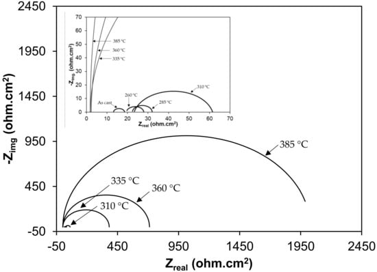 The heat-treated samples were subjected to electrochemical measurements in a 0.5 M H2SO4 and 3.5% NaCl solution at 25 °C (±2 °C). The electrochemical studies were performed in a triplicate set of samples to obtain reproducible results. A cell composed of three electrodes was created, including a graphite one, which acts as a counter electrode; a saturated calomel electrode (SCE), which acts as a reference electrode; and the GCI sample which acts as the working electrode (WE), for potentiodynamic polarization and electrochemical impedance spectroscopy (EIS) measurements. The WE area was fixed at 1 cm2. Prior to the tests, the samples were ground and polished using SiC papers of 2500 grit size and rinsed in deionized water followed by immersion in the solution for 30 min in order to stabilize the open circuit potential value. The potentiodynamic polarization tests were carried out from −1.0 to +1.0 V at a scan rate of 1 mV/s, whereas, EIS tests were performed over a frequency ranging from 100 kHz to 0.01 Hz.