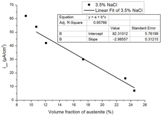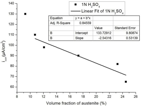 Figure 13 and Figure 14 show the plots of Icorr obtained from the potentiodynamic polarization diagram against the volume fraction of the austenite for 3.5% NaCl and 1 N H2SO4, respectively. It was observed that with the increasing volume fraction of austenite, the corrosion rate decreased linearly to a sufficient extent in both cases. The linear fit regression value was 0.95 for 3.5% NaCl solution (Figure 13) and 0.84 for 1N H2SO4 solution (Figure 14). A regression value close to 1 means the corrosion rate changes linearly with increasing austenite content.