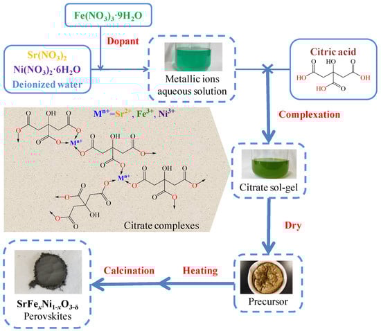 SrFexNi1−xO3−δ perovskites are fabricated using the citrate sol-gel method, which could be clearly observed from Figure 1 [24,25]. Firstly, stoichiometric amount of corresponding metal raw materials was determined, and the molar ratio of Sr: Ni: Fe: citric acid = 1: 1−x: x: 2.5, where x represented the doping content of Fe (x = 0, 0.1, 0.2, 0.3, 0.4 and 0.5). Then metal nitrates were fully dissolved in moderate deionized water to derive metallic ions aqueous solution. The mixture of both metallic ions, aqueous solution, and citric acid gently reacted at 80 °C for an appropriate time to form citrate complexation under magnetic stirring (rotational speed of 120 rpm), then dried (120 °C, 12 h) to evaporate the excess water in citrate sol-gel. Finally, precursors of SrFexNi1−xO3−δ were calcined in a muffle furnace through a temperature-programmed route, which was linearly heated to 300 °C and maintained for 1 h, then kept at high temperature (600–750 °C) for 2 h under an air atmosphere (heating rate of 5 °C min−1). The desired SrFexNi1−xO3−δ (x = 0, 0.1, 0.2, 0.3, 0.4 and 0.5) perovskites were obtained. In this work, the effect of reaction time for citrate sol-gel, calcination temperature, and doping content of Fe were discussed for fabricating SrFexNi1−xO3−δ perovskites.