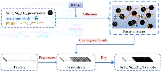 Preparation of the SrFexNi1−xO3−δ/Ti anode is schematically displayed in Figure 2. Firstly, a titanium (Ti) plate (Grade TA2, 80.0 mm × 17.0 mm × 1.8 mm) was polished to remove the superficial oxide layer, degreased in hot detergent, and then etched by sharp blades to produce a rough grid surface, which served as the Ti substrate [26]. Afterward, anodic materials mentioned in Table 1 (SrFexNi1−xO3−δ perovskites, acetylene black, PVDF and DMAc in a mass ratio of 56:7:7:30) [27] were fully mixed into a viscous paste and uniformly coated on the Ti substrate with a spatula. Finally, the SrFexNi1−xO3−δ/Ti anode was prepared after being dried at 80 °C for 2 h.