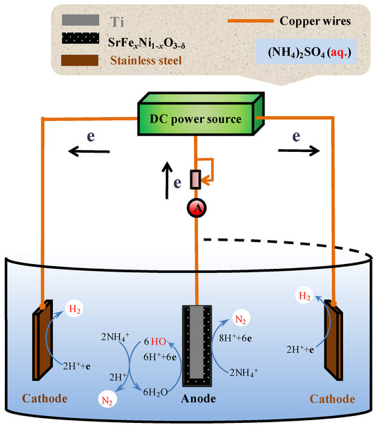 As shown in Figure 3, the ECR was a single compartment reactor (height of 120.0 mm, bottom diameter of 93.0 mm) and constructed with one anode and two cathodes: SrFexNi1−xO3−δ/Ti as the anode and stainless steels as the cathodes. All the electrodes were vertically fixed with a constant gap (20.0 mm) and both sides of Ti substrate (effective area of 5.10 cm2) were coated with the electrode materials. Simulated nitrogenous wastewater ((NH4)2SO4 solution, volume of 300 mL, initial TN concentration of 150 mg L−1) was intermittently poured into the ECR and forced to flow in turbulence by a magnetic stirrer (rotational speed of 120 rpm). ECR was powered just by a source of direct current (DC) connecting the amperemeter and slide rheostat with copper wires. Electrocatalytic current could be directly monitored from the amperemeter and the electrocatalytic current density was calculated by Equation (2). In addition, the electrocatalytic voltage was read by the digital multimeter between anode and cathode. The resistance, conductivity, and power density of ECR could be derived from Equations (3)–(5), respectively.