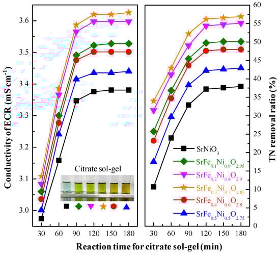 During the fabrication of SrFexNi1−xO3−δ perovskites (calcination temperature of 700 °C), the effect of reaction time for citrate sol-gel on the electrocatalytic properties (TN removal ratio and conductivity of ECR) is illustrated in Figure 4. Obviously, TN removal ratio and the conductivity of ECR improve along with the reaction time for citrate sol-gel from 30–120 min, and then basically remain unchanged over 120 min. The results suggest the complexation between citric acid and metallic ions (Sr2+, Ni3+, and Fe3+) gradually increases in the citrate sol-gel, which is beneficial to fabricate the SrFexNi1−xO3−δ perovskites and promote their electrocatalytic properties within 120 min. Moreover, among the SrFexNi1−xO3−δ (x = 0, 0.1, 0.2, 0.3, 0.4 and 0.5) materials, SrFe0.3Ni0.7O2.85 achieves the superior TN removal ratio (56.20%) and conductivity of ECR (3.62 mS cm−1) at the reaction time of 120 min for citrate sol-gel. Thus, the optimum reaction time for citrate sol-gel is chosen as 120 min, over which the conductivity of ECR and the TN removal ratio have no obvious improvements.
