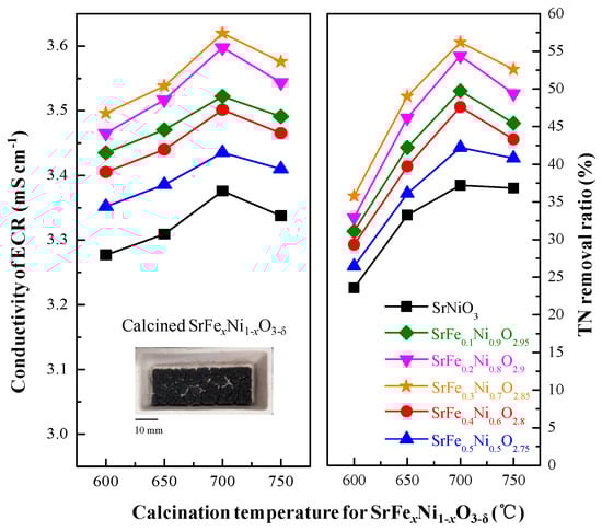 In light of the reaction time of 120 min for the citrate sol-gel, the effect of calcination temperature on the electrocatalytic properties of SrFexNi1−xO3−δ clearly presents in Figure 5. With improving the calcination temperature for SrFexNi1−xO3−δ, both the conductivity of ECR and the TN removal ratio firstly increase and then drop, of which the peak values appear at 700 °C. This is because the SrFexNi1−xO3−δ materials gradually form and stabilize the perovskite-type structure when their calcination temperatures increase from 600–700 °C. However, in terms of SrFexNi1−xO3−δ materials, higher calcination temperatures (750 °C) probably destroy their crystal structure and framework [31]. Similarly, among the SrFexNi1−xO3−δ (x = 0, 0.1, 0.2, 0.3, 0.4 and 0.5) materials, SrFe0.3Ni0.7O2.85 achieves superior electrocatalytic activity (TN removal ratio of 56.20%) and ECR conductivity of 3.62 mS cm−1 at the calcination temperature of 700 °C. Thereby, the optimum calcination temperature for fabricating SrFexNi1−xO3−δ materials is considered as 700 °C.