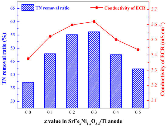 With regard to the optimum fabrication conditions (reaction time of 120 min for citrate sol-gel and a calcination temperature of 700 °C), the SrFexNi1−xO3−δ materials with different doping contents of Fe (x value) were coated on the anode in ECR, and their electrocatalytic properties were recorded in Table 2. The electrocatalytic voltage and power density of ECR with SrFexNi1−xO3−δ/Ti anode firstly drop and then ascend, raising the x. Additionally, both the TN removal ratio and conductivity of ECR give the inverse tendency plotted in Figure 6 that results from the increase of oxygen vacancies and the decline of t with the increase of x in SrFexNi1−xO3−δ perovskites. Among the SrFexNi1−xO3−δ (x = 0, 0.1, 0.2, 0.3, 0.4 and 0.5) materials, SrFe0.3Ni0.7O2.85 has the highest conductivity of ECR (3.62 mS cm−1) and TN removal ratio (56.20%), manifesting its superior conductivity and electrochemical activity. Therefore, the optimum doping content of Fe in SrFexNi1−xO3−δ is x = 0.3.