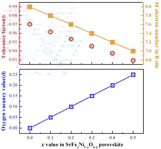 In the SrFexNi1−xO3−δ perovskites, electron exchange process of B-site elements takes place due to different ionic valence states between Fe (III) and Ni (IV), promoting the electronic and conductivity and the electron transmission capacity. Meanwhile, the Fe element has more empty 3d orbits (Fe: 3d64s2, four empty 3d orbits) and can be beneficial to deliver the electrons as compared with the Ni element (Ni: 3d84s2, two empty 3d orbits) in the B-site. With raising the x, low-valent substitution in the B-site increases the oxygen vacancies according to the electroneutrality, which can also improve the ionic conductivity and electrocatalytic reactivity of SrFexNi1−xO3−δ perovskites. However, the large x value relates to the low t value, which consequently leads to the oxygen octahedral distortion of perovskite owing to the Jahn-Teller effect, and the deviation from the standard cubic crystal structure conversely decreases the electrocatalytic reactivity and conductivity by doping [32,33].