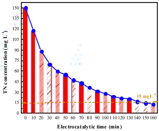 In order to investigate the effect of electrocatalytic time and further decrease the TN concentration of wastewater to a lower level, ECR with the SrFe0.3Ni0.7O2.85/Ti anode (current density of 11.76 mA cm−2 and SrFexNi1−xO3−δ materials amount of 0.09804 g cm−2) is applied to treat the nitrogenous wastewater under the optimum conditions for fabricating SrFexNi1−xO3−δ materials (reaction time of 120 min for citrate sol-gel and calcination temperature of 700 °C). TN concentrations are measured at the corresponding electrocatalytic time, and their variation trend is shown in Figure 8. With the increase of electrocatalytic time, TN concentration of wastewater in ECR gradually declines and reaches below 15 mg L−1 at an electrocatalytic time of 150 min. At the same time, wastewater treated by ECR satisfies the discharge standard of pollutants for municipal wastewater treatment plants in China (GB 18918-2002 [29], Class I-A Standard, TN ≤ 15 mg L−1) with a TN removal ratio of 91.33% (from 150 mg L−1 to 14.62 mg L−1). In the range of low TN concentrations (15–60 mg L−1), the variation trend of the TN concentration with the electrocatalytic time is evidently slow, possibly contributing from the reduction of the concentration driving force for limiting the electrocatalytic efficiency. On the aspect of the wastewater quality standard, the appropriate electrocatalytic time can be chosen as 150 min, over which the nitrogenous wastewater treated by ECR meets the discharge standard of pollutants for municipal wastewater treatment plants in China (GB 18918-2002 [29], Class I-A Standard, TN ≤ 15 mg L−1). In conclusion, the optimum operating conditions and performance of ECR with SrFexNi1−xO3−δ/Ti anode are summarized in Table 3.