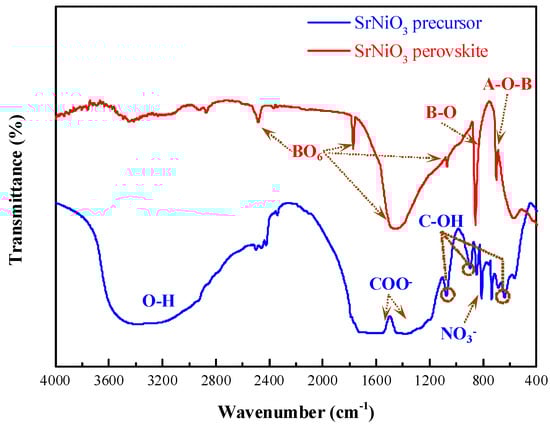 FT-IR spectra of perovskite-type SrNiO3 and SrNiO3 precursor were displayed in Figure 10. The SrNiO3 precursor was fabricated without the heat treatment and calcination process and the SrNiO3 perovskite was subsequently fabricated after heating and calcining the SrNiO3 precursor. In accordance with the literature [34,35], the wide and intensive absorption peak approximately ranging from 3000–3500 cm−1 can be assigned to the stretching vibration of O–H. Characteristic adsorption peaks at 640 cm−1, 895 cm−1, and 1074 cm−1 represent the C–H vibration. Meanwhile, the peaks of 1388 cm−1 and 1589 cm−1 belong to the stretching vibration of COO−, mainly contributing from the residual citric acid in the SrNiO3 precursor. Furthermore, the out-plane vibration of 812 cm−1 can be ascribed to nitrate radicals in the raw reagent.